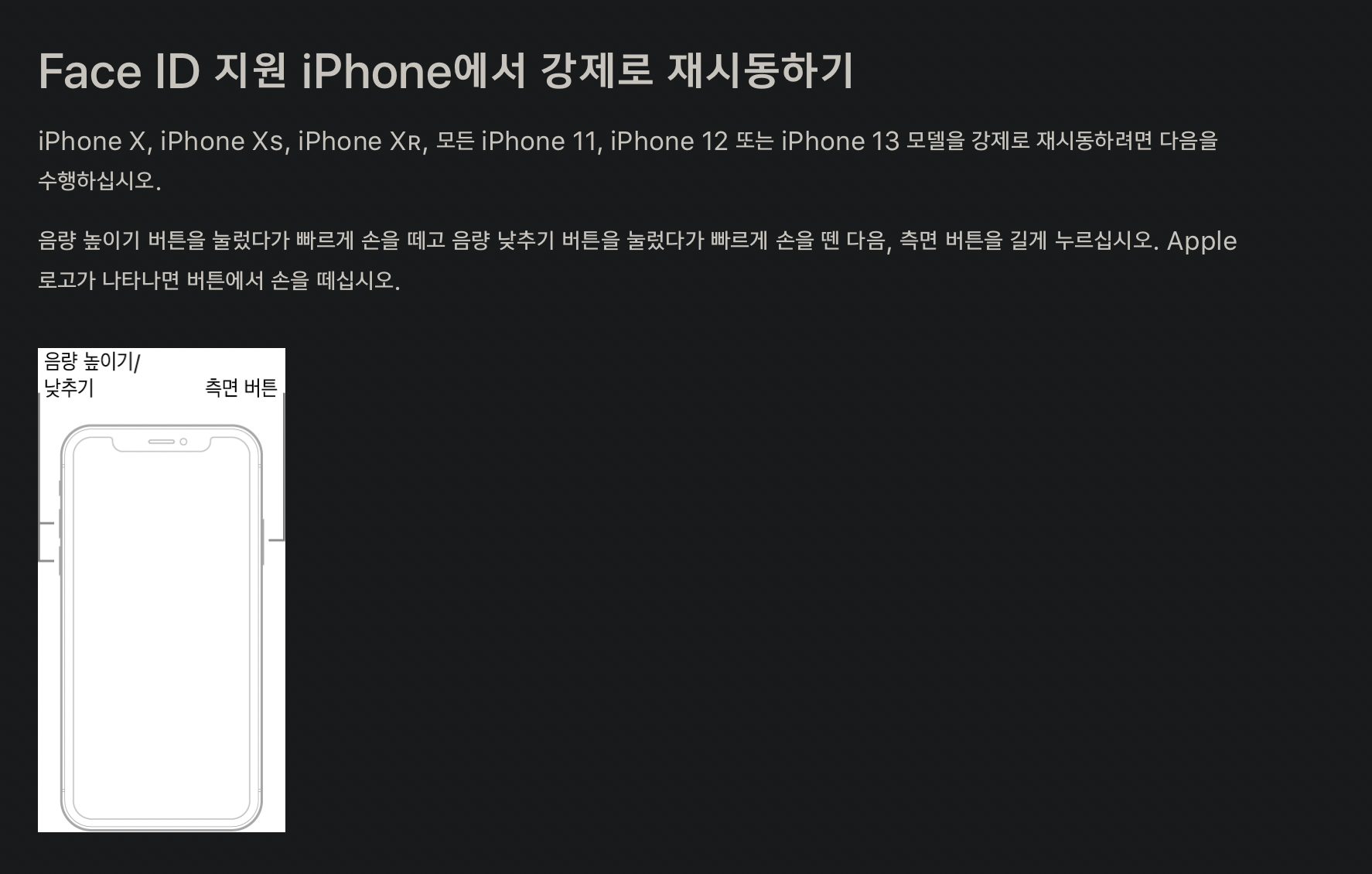 안에 들어가면 모델별로 강제 재부팅 하는 방법들이 싹 다 있는데 일단 이 블로그에는 페이스아이디 지원 모델만 공유하도록 하겠습니다.