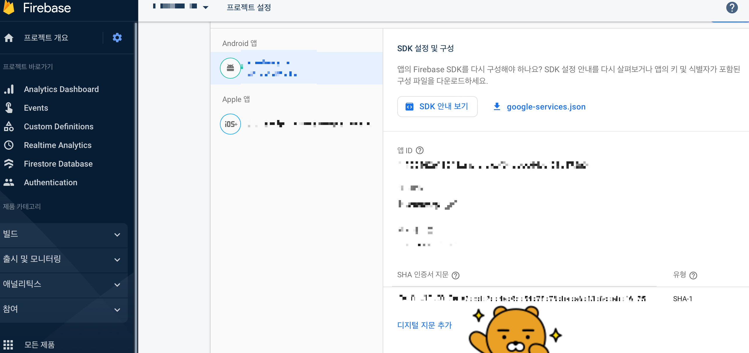 위의 SHA-1값을 복사해서 파이어베이스 콘솔의 프로젝트 설정에 들어간뒤 디지털 지문에 추가해준다