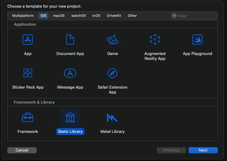 Xcode에서 Static 라이브러리를 선택하고 언어를 선택한다. 오브젝트C는 언어가 그지같으니 스위프트 선택