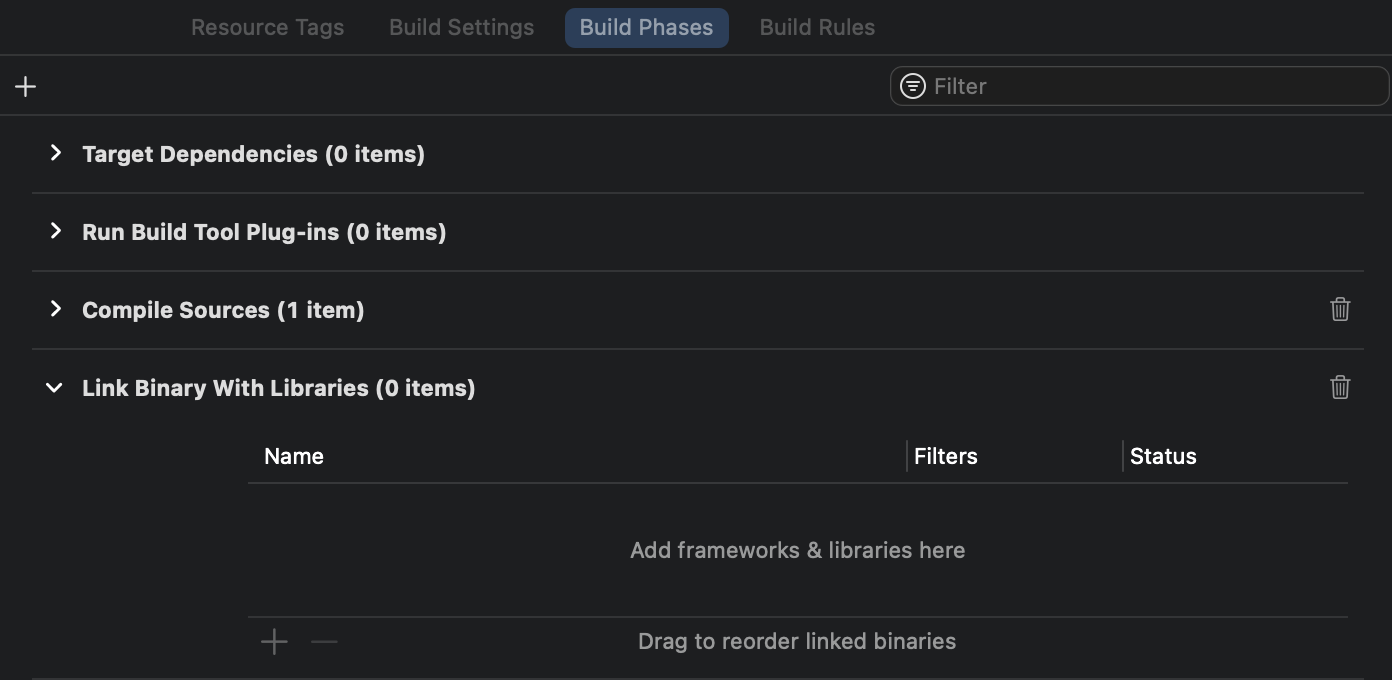 먼저 아래에 BuildPhases 탭에서 Link Binary With Libraries에다가 .a 파일을 드래그해서 던져준다