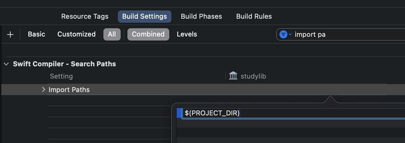 다음으로 Import Paths에 swiftmodule 폴더의 위치를 지정해준다. 라이브러리와 똑같은 경로로. 지정해주는 예시이다.