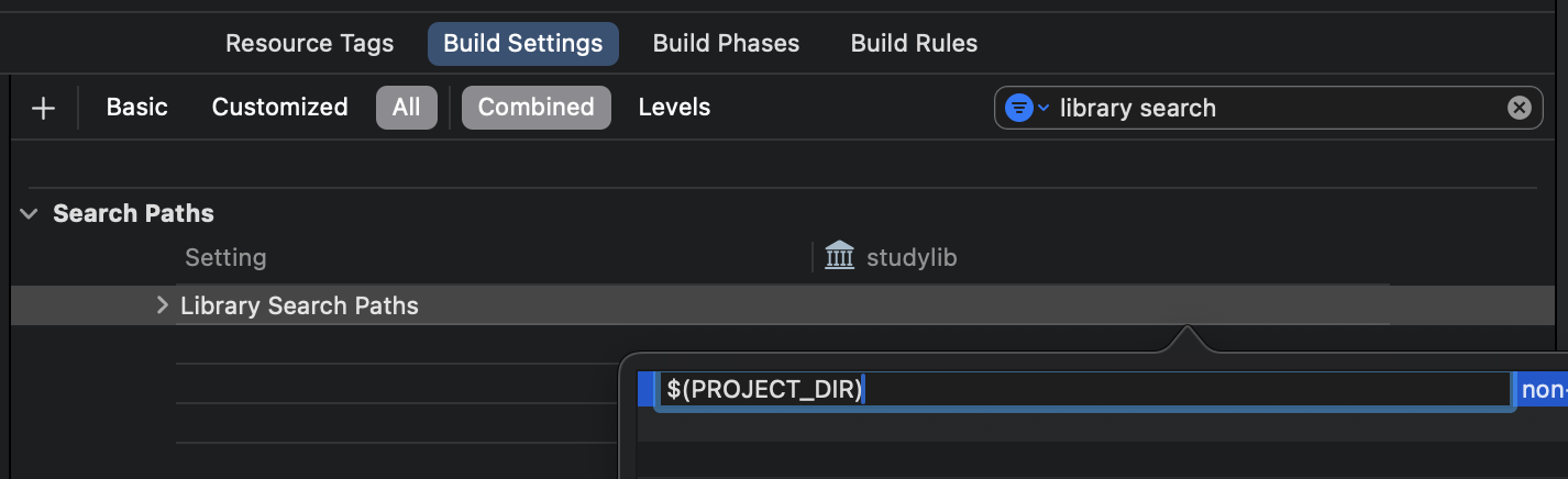 만약 라이브러리르 오브젝트C로 만들었다면 헤더파일 경로를 지정해 주어야 한다. 이는 BuildSettings의 Header Search Path에서 설정 가능하다