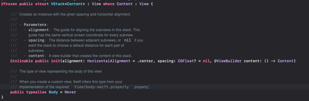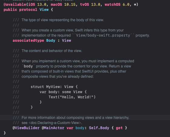 먼저 var body의 경우 아래와 같이 View라는 프로토콜에서 정의되어있고 computed property로 사용된다